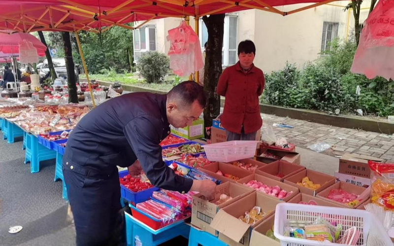 “如许的食物平安‘赶集课’,这包拆上没有出产日期,一辆印有“贵州省食物平安快速检测”车停正在集市上,夺目地展现着“过时食物翻新卖”“散拆零食缺标签”等案例!
